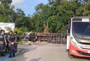 Carreta tomba no Distrito Industrial e deixa trânsito lento em Manaus; veja vídeo