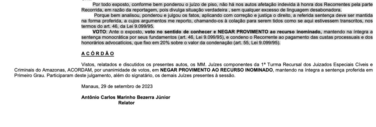 Em outro trecho, a magistrada cita que o conteúdo veiculado foi informativo e está resguardado pelo exercício da liberdade de expressão.