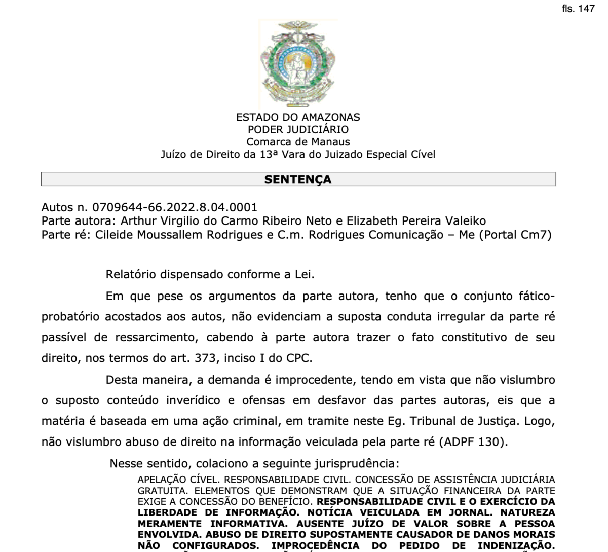 A Juíza Cláudia Monteiro Pereira Batista julgou o pedido de Arthur e Betinha, para que o Portal CM7 apagasse o conteúdo publicado e lhe pagasse uma indenização, como improcedente. “A demanda é improcedente, tendo em vista que não vislumbro o suposto conteúdo inverídico e ofensas em desfavor das partes autoras, eis que a matéria é baseada em uma ação criminal, em tramite neste Eg. Tribunal de Justiça. Logo, não vislumbro abuso de direito na informação veiculada pela parte ré”.
