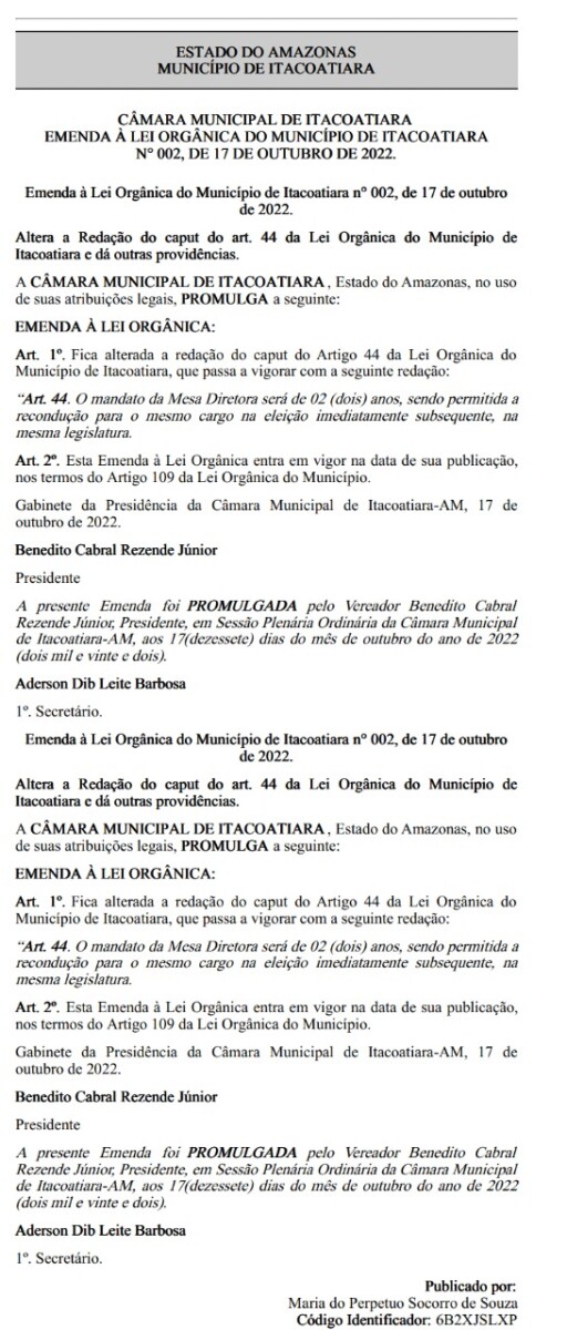 Na lei orgânica do município, não é possível se reeleger dentro do mesmo mandato, ou seja, teria que esperar terminar os quatros anos, para poder tentar a reeleição. A votação foi nesta segunda-feira (17), e, publicada na data de hoje (19), no Diário Oficial do Município.