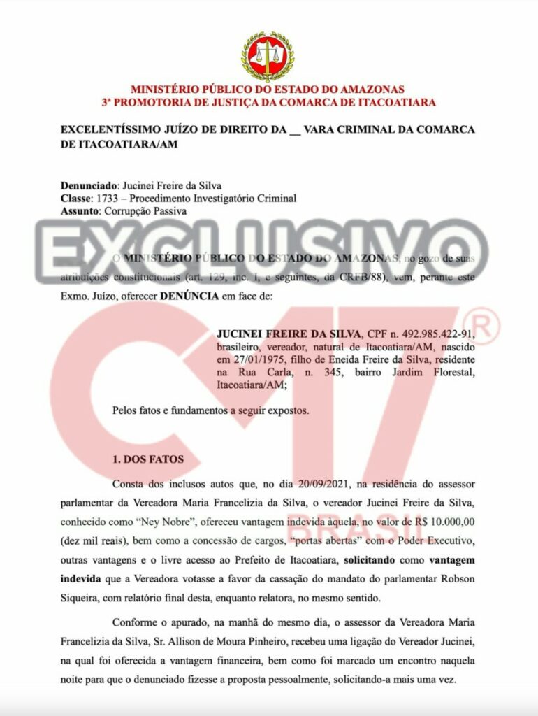 Amazonas – O vereador Jucinei Freire da Silva, mais conhecido como Ney Nobre, está no centro de uma denúncia apresentada pelo Ministério Público do Amazonas.