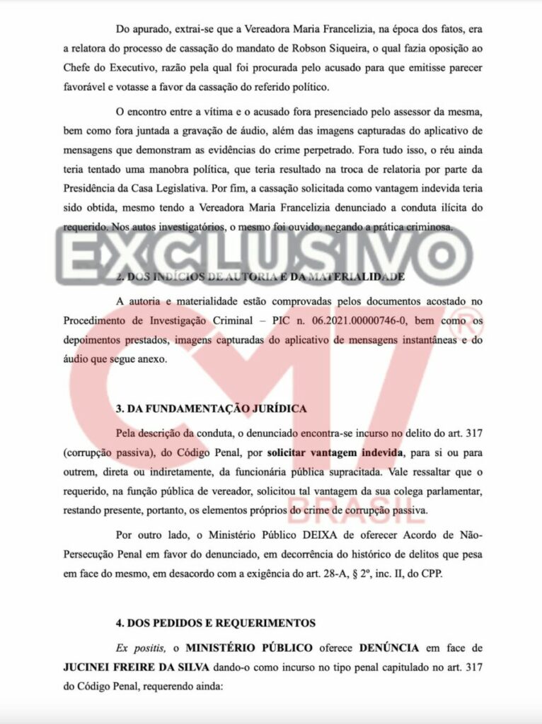 A denúncia ressalta que Maria Francelizia era relatora do processo de cassação do mandato de Robson Siqueira na época dos fatos, o que teria motivado a abordagem do vereador Ney Nobre.