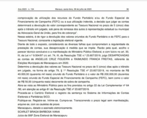 Diante das irregularidades encontradas, a juíza da 006ª Zona Eleitoral de Manacapuru, Scarlet Braga Barbosa, determinou que Ângelus Figueira e Raimundo França devolvam ao Tesouro Nacional do Fundo Partidário a quantia de R$ 40 mil, provenientes do Fundo Especial de Financiamento de Campanha (FEFC), bem como o valor de R$ 50 mil referentes à sobra de campanha. Além disso, foi estabelecido o prazo de cinco dias para que os valores, somando um total de R$ 290 mil, sejam devidamente restituídos.