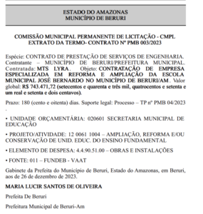 A prefeitura de Beruri não divulgou detalhes do projeto da reforma, o que dificulta a análise do valor da obra. O processo licitatório também foi alvo de questionamentos, com denúncias de possíveis irregularidades.