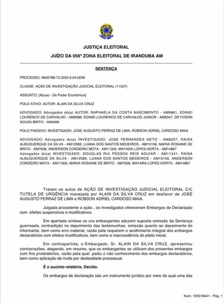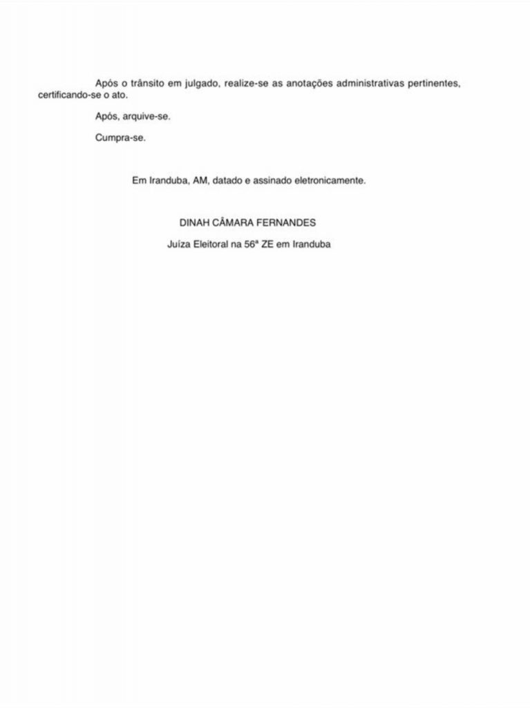 Na decisão, a Juíza Eleitoral da 56ª Zona Eleitoral de Iranduba, Dinah Fernandes, também declarou inelegibilidade da chapa pelo prazo de oito anos, a contar do período eleitoral de 2020.