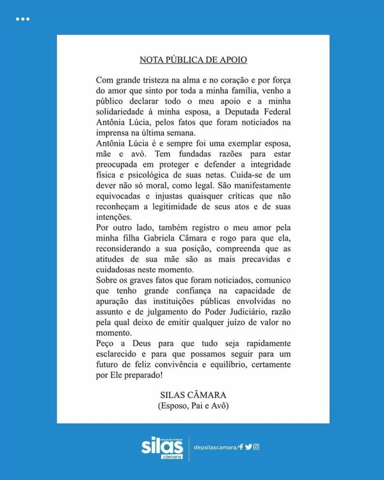 Em uma nota oficial, Silas Câmara saiu em defesa da esposa, destacando sua exemplaridade como esposa, mãe e avó. Ele condenou as acusações da filha contra Antônia Lúcia, ressaltando que ela está tomando precauções necessárias para proteger as netas. O deputado expressou seu amor pela filha Gabriela e confiança na Justiça para resolver a disputa pela guarda das crianças.