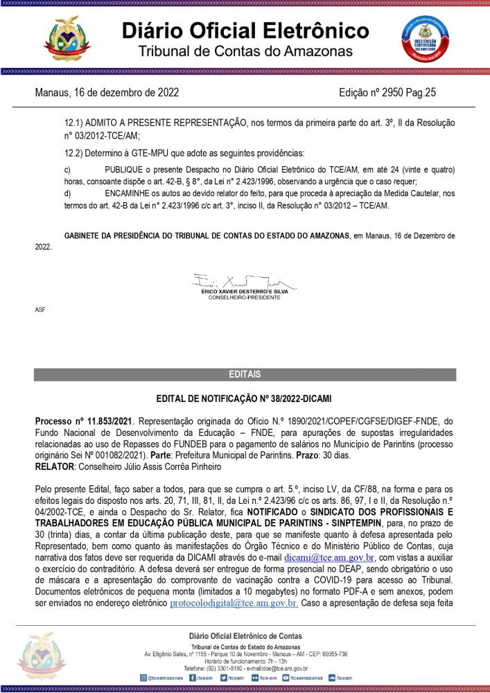 No documento expedido no último dia 16 de dezembro no Diário Oficial Eletrônico do TCE, o processo nº 11.853/2021 tem como relator o conselheiro Júlio Assis Corrêa Pinheiro e a representação foi originada de um ofício do Fundo Nacional de Desenvolvimento da Educação (FNDE). O magistrado dá um prazo de 30 dias para que o Sindicato dos Profissionais e Trabalhadores em Educação Pública Municipal de Parintins (SINPTEMPIN) se manifeste em relação à defesa do prefeito local.