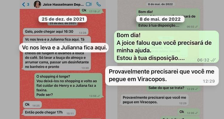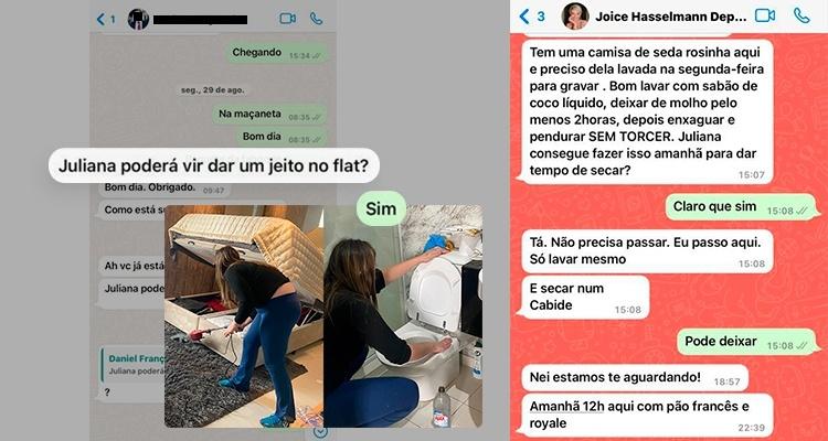 A ex-assessora afirma que também recebia ordens para limpar o apartamento de Joice. O marido da ex-parlamentar também mandava mensagens para Juliana “dar um jeito no flat”.