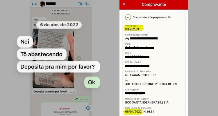A ex-deputada em conversa com o marido de Juliana pede o depósito no valor do combustível. A ex-assessora afirma que também era obrigada a cobrir gastos do marido da chefe. Para embasar a acusação, apresentou um comprovante de Pix de R$ 814 para o marido de Joice feito em 4 de maio do ano passado. Juliana conta que nem sabe para que serviu o dinheiro, apenas atendeu uma ordem, sem pedir explicação.