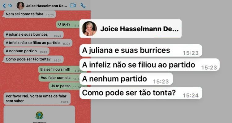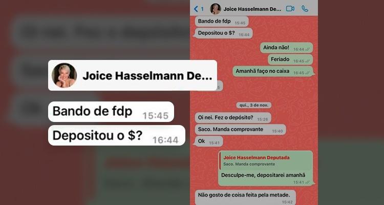 Em uma mensagem de WhatsApp enviada ao marido de Juliana, a ex-assessora é chamada de “fdp” porque não depositara o dinheiro aguardado por Joice. Ela repassou à reportagem áudio que mostra a maneira como era tratada por Joice.