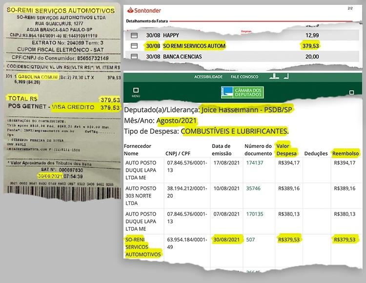 Uma nota fiscal no sistema de cota parlamentar da Câmara mostra que Joice foi reembolsada por um abastecimento na cidade de São Paulo em 30 de agosto de 2021. O valor da conta foi de R$ 379,53. Juliana afirma que foi seu salário que bancou o gasto.