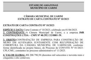 Câmara Municipal de Uarini vai gastar mais de R$ 200 mil com construção de um muro; veja documento