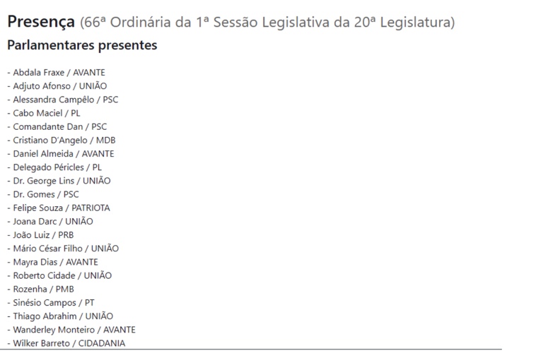 Segundo dados do Sistema de Apoio ao Processo Legislativo (SAPL), dos 24 deputados estaduais, apenas 21 estiveram presentes na sessão de retorno do recesso parlamentar, que começou no último 14 de julho.