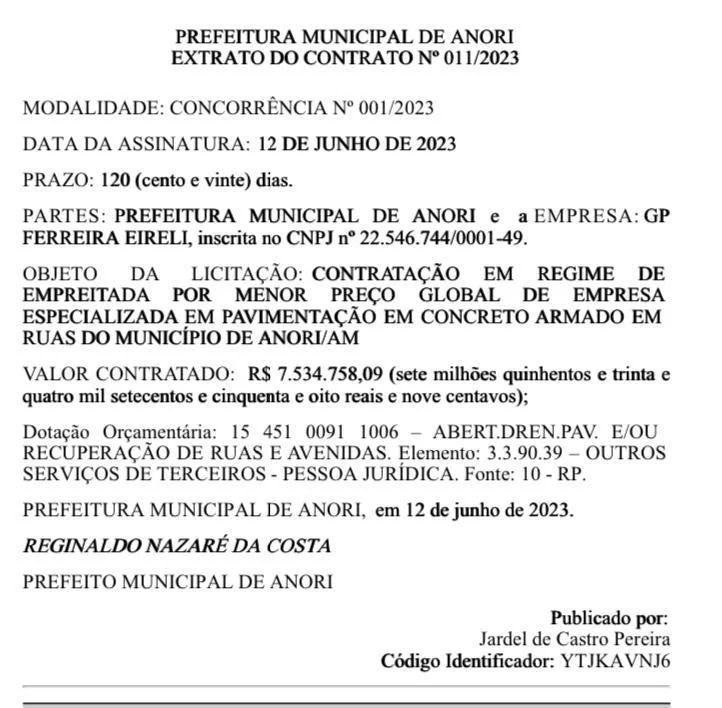 De acordo com as informações reveladas, a contratação da empresa GP FERREIRA EIRELI, por meio de uma concorrência, foi realizada sem a divulgação dos detalhes sobre quais ruas e bairros seriam contemplados. A falta de transparência na destinação dos recursos públicos levanta sérias preocupações sobre possíveis irregularidades e favorecimentos indevidos. A compra foi realizada por meio de Concorrência, com o Despacho de Homologação publicado no Diário Oficial dos Municípios do Amazonas (AAM), no último dia 12 de junho, e terá a duração de 120 dias.