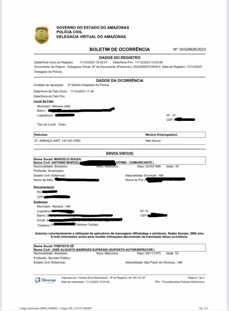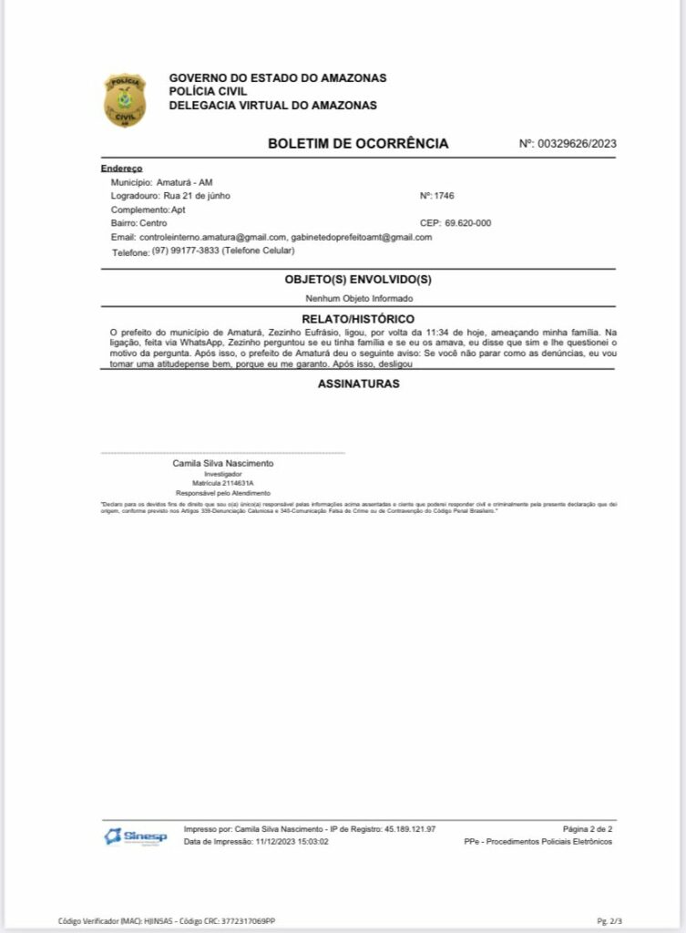 O veículo de imprensa realizou um Boletim de Ocorrência sobre o caso, e está em posse de todas as provas, prometendo uma matéria completa que promete ser o maior escândalo já enfrentado por Amaturá.