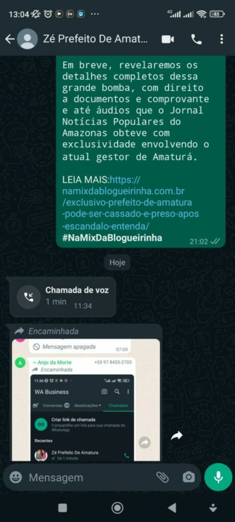 Amazonas – O prefeito de Amaturá, Zezinho Eufrásio, se envolveu em um escândalo após desencadear uma série de ameaças diretas contra o diretor-geral do Jornal Notícias Populares do Amazonas, Marcelo Souza. O episódio, ocorrido por volta das 11:30 desta segunda-feira (11) via WhatsApp, deixou a comunidade local e a imprensa perplexas.