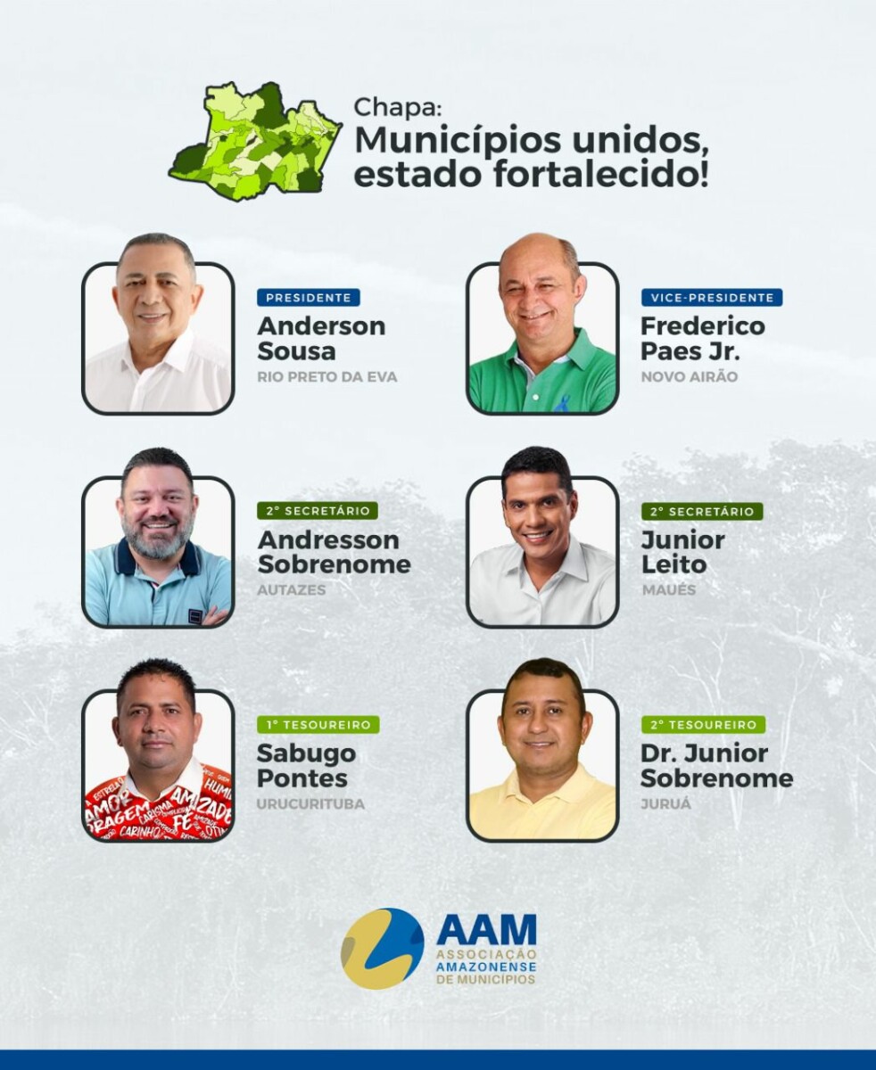 Até o momento uma das chapas homologadas é a do prefeito de Rio Preto da Eva, Anderson Souza. A chapa “Municípios Unidos, estado fortalecido” conta com os seguintes membros: