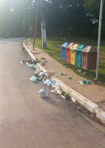 A população, ao acordar com suas lixeiras abarrotadas de resíduos, denuncia que a situação é resultado da falta de pagamento à empresa de limpeza pública que atendia o município.