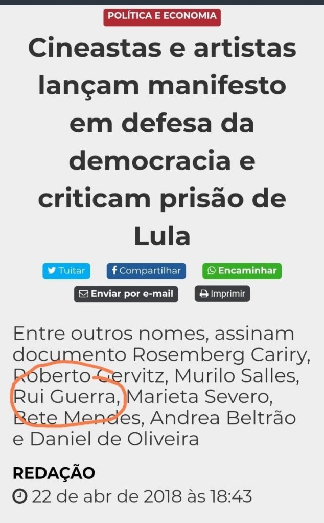 O cineasta Rui Guerra, responsável pela produção do filme A Fúria, onde surgiu s polemica em torno da cena do suposto atentado contra o presidente Jair Bolsonaro (PL), assinou o documento contra a prisão de Lula.