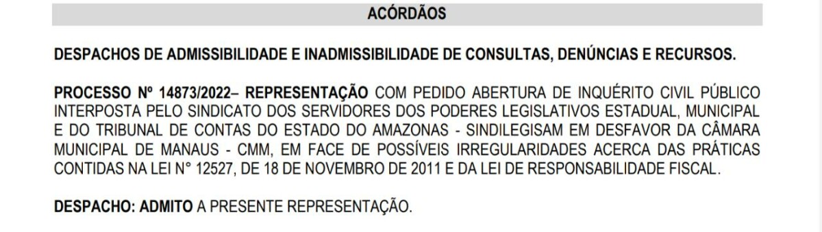que admitiu Representação contra a Câmara Municipal de Manaus (CMM) por possíveis irregularidades.