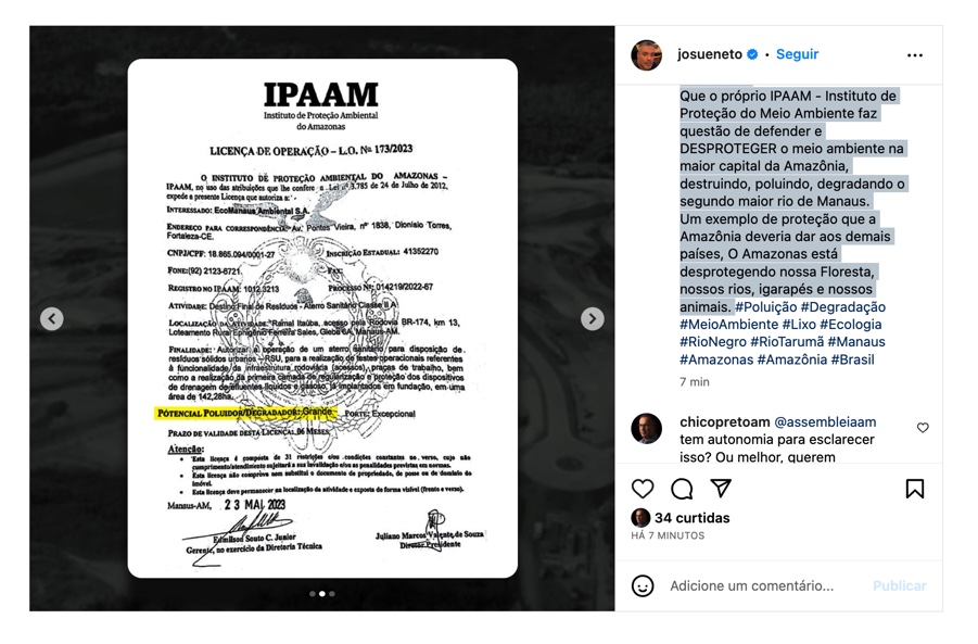 “A lixeira do KM 13 na BR-174 recebeu uma licença de operação em maio deste ano. Peço a atenção para dois pontos MUITO IMPORTANTES: 1- existe decisão do STF, Superior Tribunal Federal, de proibir esse tipo de construção em áreas de proteção. Portanto, é uma construção ILEGAL. 2- A própria licença de operação confirma que o grau e potencial degradador e poluidor é GRANDE! Ora, a partir do momento que é dada uma licença a algo ILEGAL e que tem um alto PODER de POLUIÇÃO e degradação, a pergunta é: qual é o tamanho dessa vergonha? O que há por trás dessa licença VERGONHOSA? O que tem escondido atrás dessa licença ABSURDA? Que o próprio IPAAM – Instituto de Proteção do Meio Ambiente faz questão de defender e DESPROTEGER o meio ambiente na maior capital da Amazônia, destruindo, poluindo, degradando o segundo maior rio de Manaus. Um exemplo de proteção que a Amazônia deveria dar aos demais países, O Amazonas está desprotegendo nossa Floresta, nossos rios, igarapés e nossos animais.”.