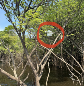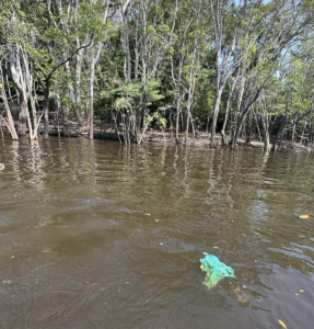 “Esse é o lixo que encontrei e recolhi ao longo de 10 minutos pelo Rio Tarumã-Açu. Em seguida fotos com sacos de plástico (extremamente poluente) encontrados nas árvores pois, quando o rio baixa, os plásticos ficam preso nas árvores! Foto com sacos de lixo no rio e ainda pedaços de isopor também dentro da floresta em área alagadiça. Sabe o que isso quer dizer? Que mesmo sem lixeira, o Rio Tarumã já sofre com a poluição. Agora vamos imaginar uma lixeira às margens das nascentes do Rio Tarumã! O assoreamento e o chorume vão acabar com o Rio Tarumã-Açu! O IPAAM Instituto de PROTEÇÃO do Amazonas, não faz o necessário: PROTEGER o meio ambiente dentro de Manaus! Uma vergonha”.