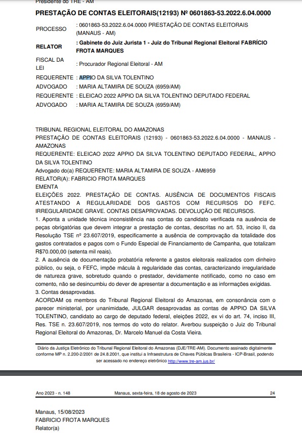 Amazonas – O Tribunal Regional Eleitoral do Amazonas (TRE-AM) emitiu uma decisão desaprovando as contas do ex-superintendente da Superintendência da Zona Franca de Manaus (Suframa), Appio Tolentino. As contas estão relacionadas à sua candidatura ao cargo de deputado federal nas eleições de 2022 pelo partido Solidariedade.