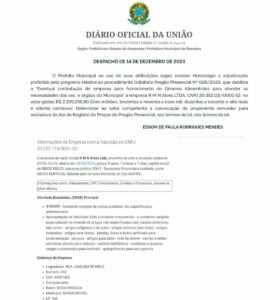 O contrato no valor de R$ 2,3 milhões destina-se ao fornecimento de gêneros alimentícios para instituições municipais, conforme divulgado no Diário Oficial da União (DOU).