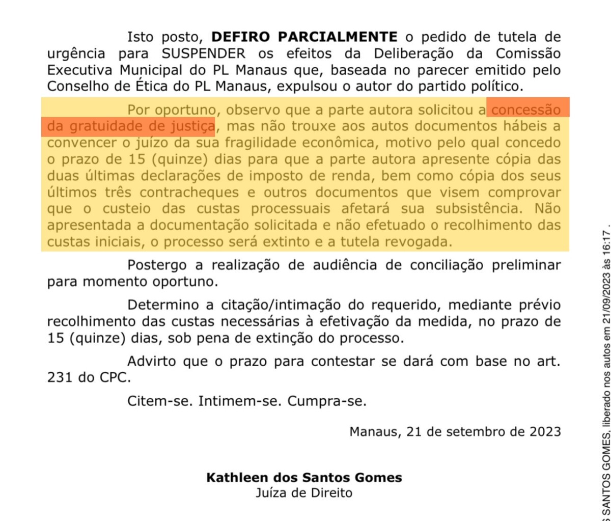 A informação está na decisão provisória emitida na última quinta-feira (21) da juíza Kathleen dos Santos, da 18ª Vara Cível, que além de suspender provisoriamente a expulsão de Menezes do Partido Liberal (PL) no Amazonas, também dá o prazo de 15 dias para o ex-candidato provar a fragilidade econômica. Veja: