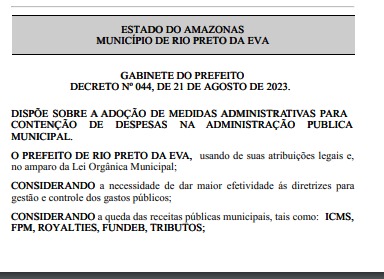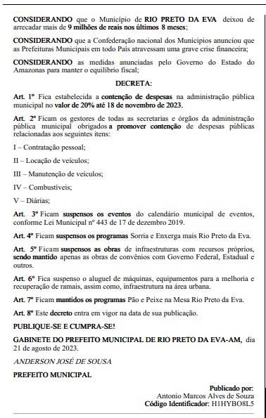 Amazonas – O prefeito de Rio Preto da Eva, Anderson Sousa (PP), está sofrendo uma onda de críticas crescentes após seu anúncio de suspensão temporária dos programas de saúde “Enxerga Mais Rio Preto” e “Sorria Mais Rio Preto”, em resposta às restrições orçamentárias impostas pelo Decreto nº 044, de 21 de agosto de 2023, que estabeleceu um corte de 20% nos gastos administrativos. Além dos programas de saúde, Anderson Sousa também suspendeu os tradicionais eventos da Feira da Laranja e da Marcha pra Jesus.