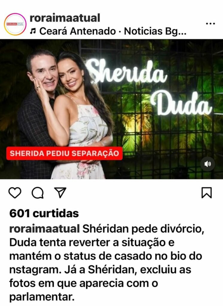 Brasil – Rumores sobre a separação do Deputado Federal Duda Ramos e sua esposa, Shéridan Oliveira, têm agitado as páginas de fofocas em Roraima nos últimos dias.