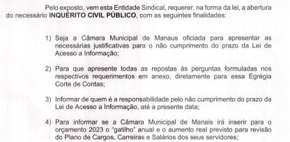 O sindicato pede David Reis seja responsabilizado, na instância administrativa e criminal, por não ter cumprido o prazo da Lei de Acesso à informação e por ter também descumprido a Lei do Plano de Cargos, Carreira e Salários dos servidores da Câmara Municipal.
