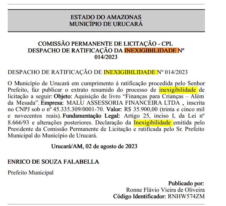 Amazonas – Em meio a uma série de desafios orçamentários e necessidades urgentes no enfrentamento de uma das maiores secas já enfrentadas no Amazonas, o prefeito de Urucará, Enrico de Souza Falabella, parece ter priorizado um investimento inusitado, aprovando a despesa de quase R$36 mil para adquirir livros de Assessoria Financeira para crianças.