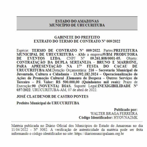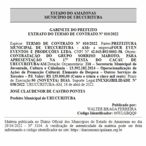 Para o evento, o prefeito José Claudenor de Castro Pontes, conhecido no local por ‘Sabugo’ (PT), realizou a contratação dos artistas no início do mês de abril, conforme o Diário Oficial Eletrônico dos Municípios do Estado do Amazonas.