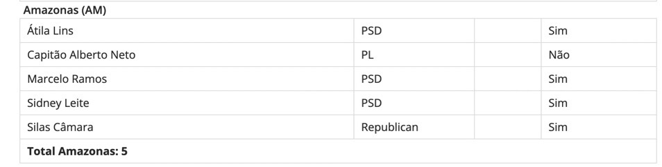 O deputado Federal Capitão Alberto Neto (PL) e o senador Plínio Valério (PSDB) garantem que votaram contra o Projeto de Decreto Legislativo, enquanto o resto da bancada amazonense mantém silêncio sobre o fato. A apuração sobre quem votou a favor da PDL 471/2022 é ainda mais complicada, uma vez que a votação não foi nominal, impedindo a consulta para saber que parlamentares votaram a favor da mudança. No entanto, é possível ver quem votou a favor da Urgência do Projeto.