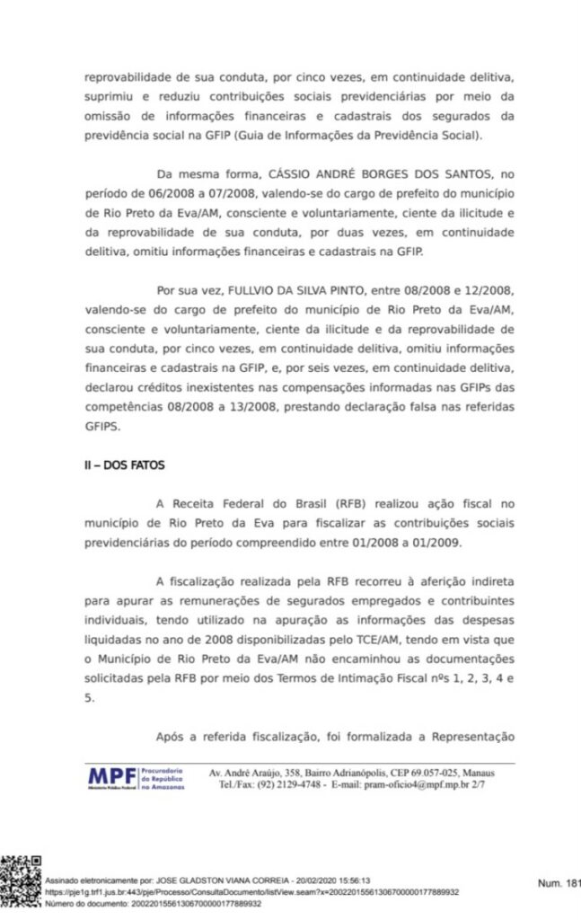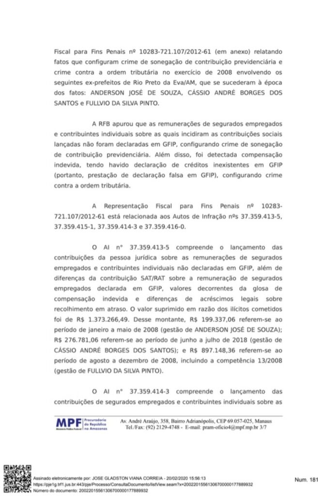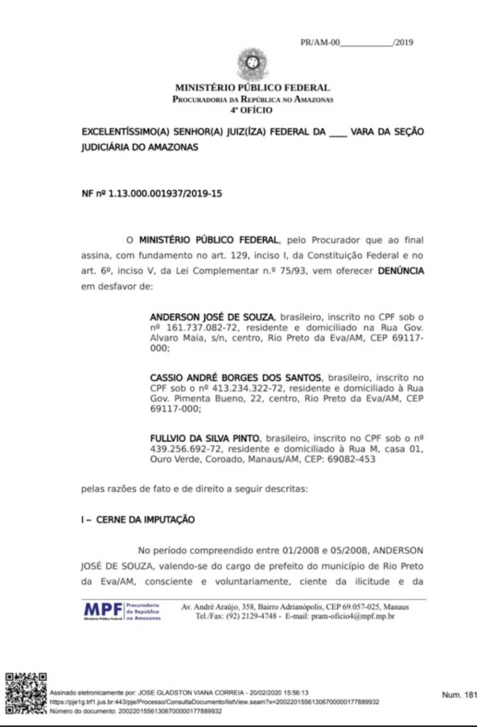 O Ministério Público Federal (MPF) denunciou o prefeito Anderson Souza (União Brasil) e outros dois ex-prefeitos do município de Rio Preto da Eva, por envolvimento em crimes contra a ordem tributária e sonegação de contribuição previdenciária. Os gestores do executivo municipal foram apontados como responsáveis por suprimir e reduzir contribuições sociais previdenciárias entre janeiro e dezembro de 2008.