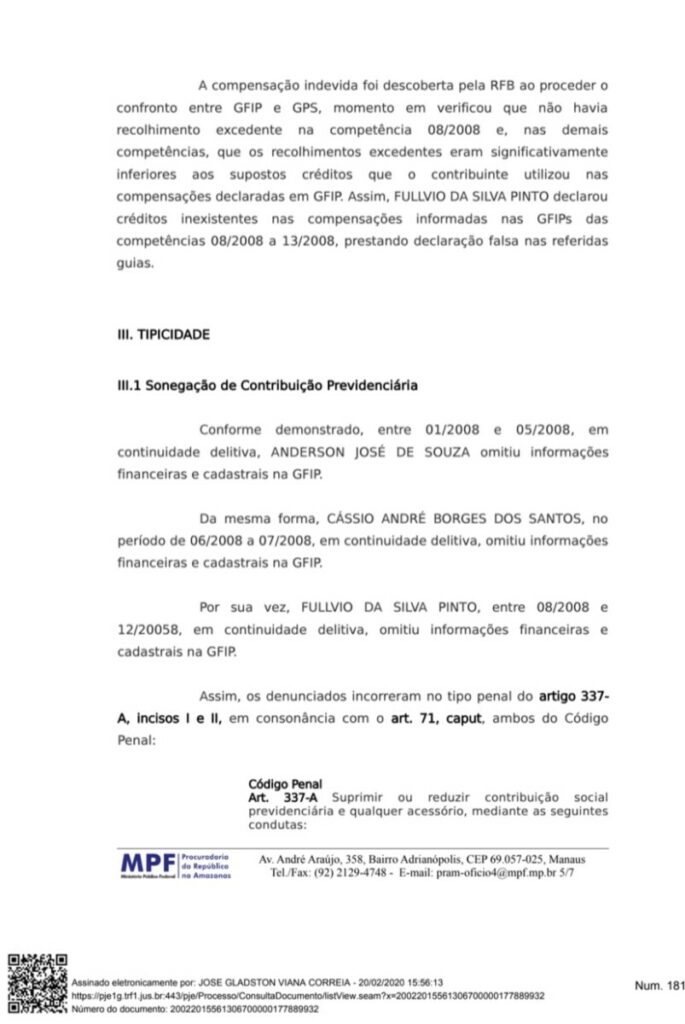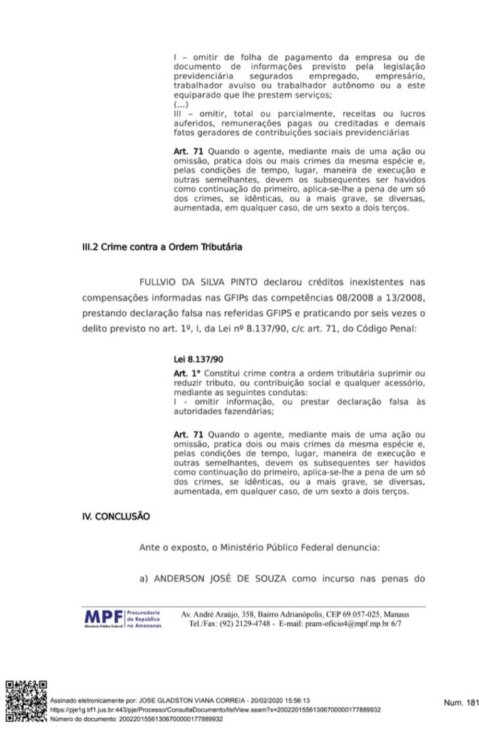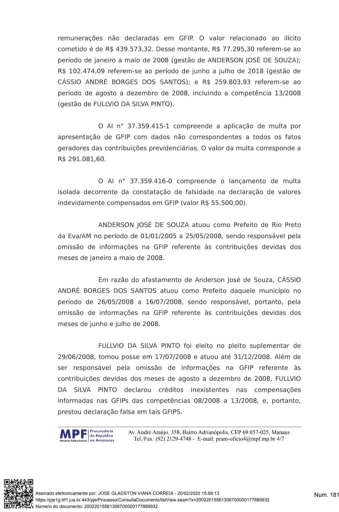 Anderson Souza é um dos acusados de ter omitido informações financeiras e cadastrais dos segurados da previdência social na Guia de Informações da Previdência Social (GFIP) durante seus mandatos. A ação penal, que corre na 4ª Vara Federal Criminal da Seção Judiciária do Amazonas (SJAM), teve sua última distribuição em 20 de fevereiro de 2020. A denúncia do MPF destaca que a Receita Federal do Brasil (RFB) iniciou uma ação fiscal em Rio Preto da Eva para investigar as contribuições sociais previdenciárias referentes ao período de janeiro de 2008 a janeiro de 2009. A fiscalização utilizou métodos de aferição indireta com base nas informações de despesas liquidadas em 2008 fornecidas pelo Tribunal de Contas do Estado do Amazonas (TCE/AM), uma vez que o município não havia enviado a documentação solicitada pela RFB por meio dos Termos de Intimação Fiscal.
