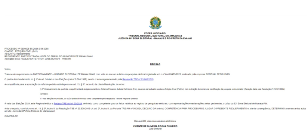 Na segunda-feira, dia 4, o juiz eleitoral Vicente Pinheiro optou por encaminhar o requerimento do partido Avante ao juízo da 62ª Zona Eleitoral de Manaus, declinando de sua competência para julgar o caso.