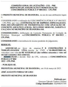O último contrato e mais recente, de 10 de março, revela um valor total de R$ 10.620.001,62 milhões que, segundo o contrato, seria para a compra de asfalto para a pavimentação de ruas da cidade, que tem uma população de 49.718 pessoas, de acordo com dados atualizados do Instituto Brasileiro de Geografia e Estatística (IBGE).