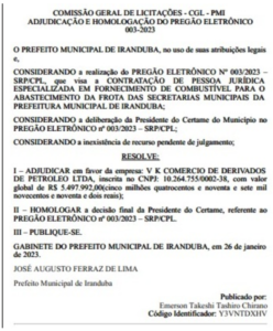 Em 26 de janeiro de 2023, a Prefeitura gastou um valor global de R$5.497.992,00 em compra de combustíveis, com a justificativa de abastecer “A frota das Secretarias da Prefeitura Municipal de Iranduba”. Entretanto, a justificativa não foi informada na licitação e não consta no Portal da Transparência do município. (Vale ressaltar que já foram gastos cerca de R$7 milhões em combustíveis, conforme documento oficial publicado no dia 17 de janeiro de 2022).
