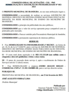 Outro contrato do prefeito, que foi publicado em 23 de fevereiro deste ano, mostra um valor total de R$1.152.535 milhão que foi destinado para a compra de materiais didáticos para educação infantil, mas não especifica detalhes como quantidades e valores unitários. É dever do chefe do executivo municipal deixar claro todos os detalhes de qualquer compra feita com dinheiro público. Leia mais aqui.