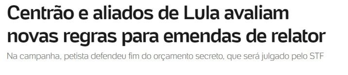 Brasil – Depois da eleição de Luiz Inácio Lula da Silva, a imprensa tradicional deixou de lado o nome “orçamento secreto” e passou a chamá-lo de “emendas do relator”. Uma das manchetes estampa a primeira página do portal UOL desta quinta-feira (3). Aliados do PT também já disseram que não há previsão, a curto prazo, para acabar com o mecanismo.
