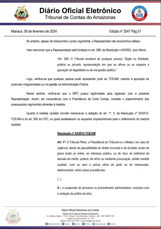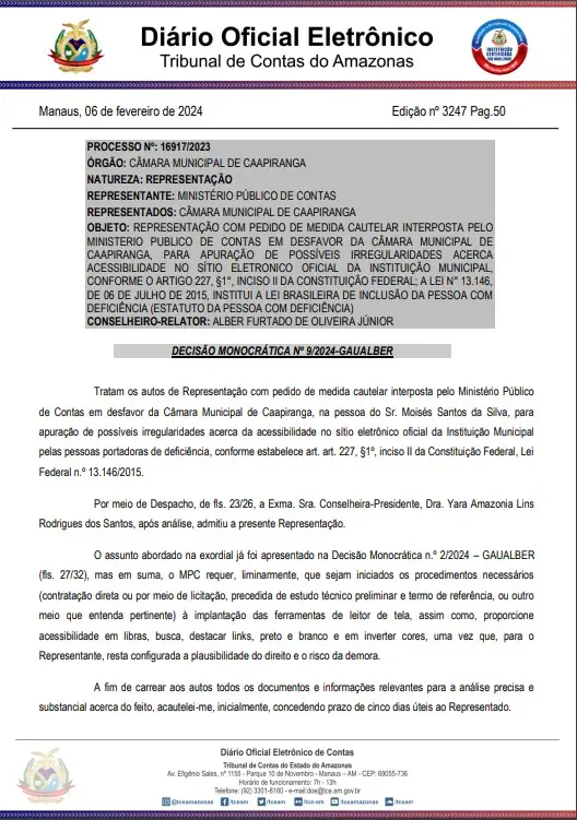 Amazonas – O Ministério Público de Contas (MPC) acionou o Tribunal de Contas do Estado do Amazonas (TCE-AM) para investigar supostas irregularidades relacionadas à acessibilidade no site oficial da Câmara Municipal de Caapiranga, sob a gestão do vereador Moisés Santos da Silva, conhecido como “Moisés Parabólica”.