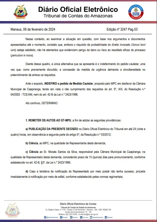 Esta medida vem após o TCE-AM ter rejeitado as contas do presidente da Câmara Municipal de Caapiranga, vereador Moisés Santos da Silva, por irregularidades no exercício de 2021.