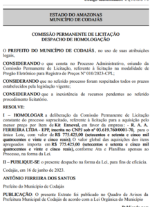O Despacho de Homologação, assinado pelo prefeito de Codajás, Antônio Ferreira dos Santos, mais conhecido como Tonho Santos, foi divulgado na edição da última sexta-feira (30) do Diário Oficial dos Municípios do Estado do Amazonas, levantando questionamentos sobre a transparência e a eficiência dos gastos públicos.