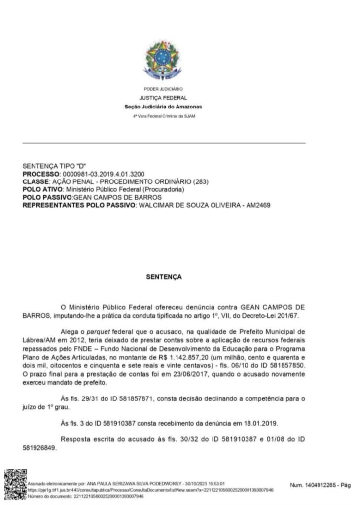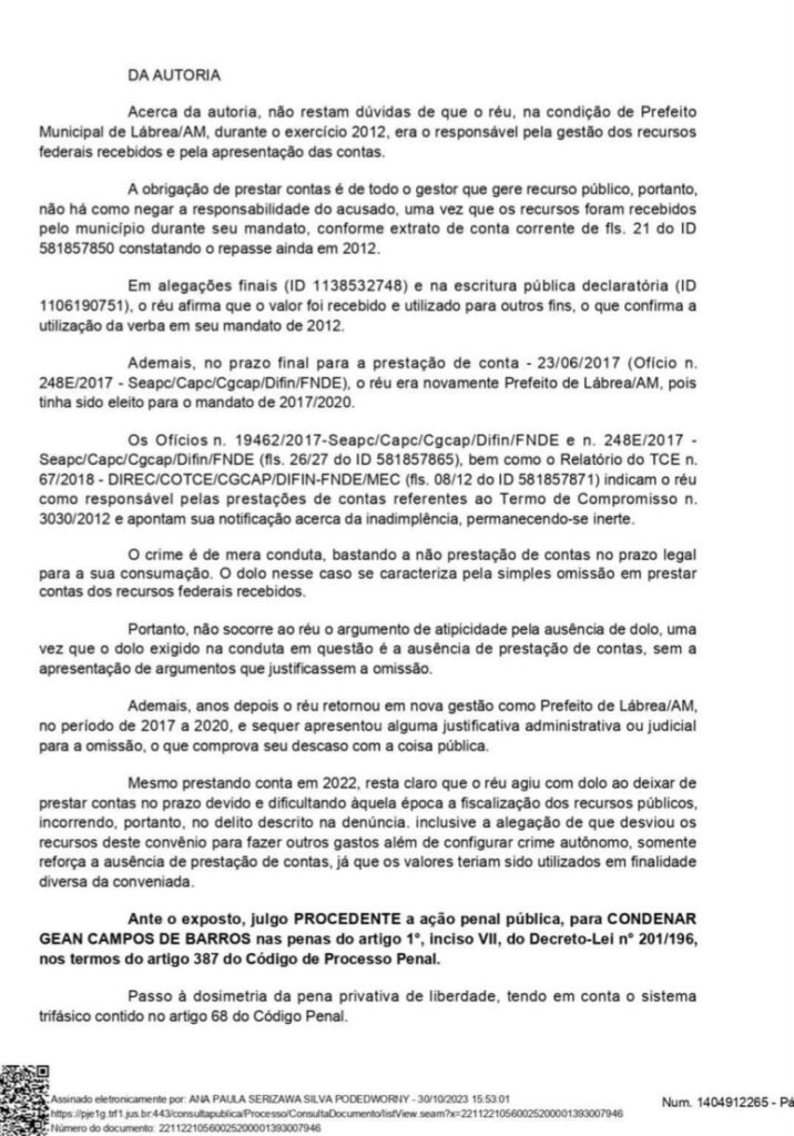 Amazonas – O prefeito de Lábrea, Gean Campos de Barros, foi condenado por não prestar contas sobre a aplicação de recursos federais repassados pelo Fundo Nacional de Desenvolvimento da Educação (FNDE) para o Programa “Plano de Ações Articuladas. A decisão foi emitida pela juíza federal Ana Paula Serizawa Silva, da 4ª Vara Federal Criminal da Seção Judiciária do Amazonas (SJAM).