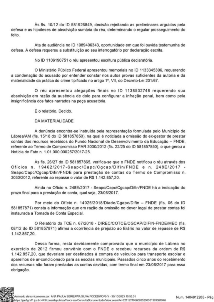 O documento da juíza destacou que o réu, na qualidade de prefeito municipal de Lábrea durante o exercício em 2012, tinha a responsabilidade de gerir os recursos federais recebidos e prestar contas. No entanto, ele só prestou contas em 2022, o que levou o Ministério Público Federal (MPF) a considerar que o gestor agiu de má-fé ao não cumprir o prazo e dificultar a fiscalização dos recursos públicos.