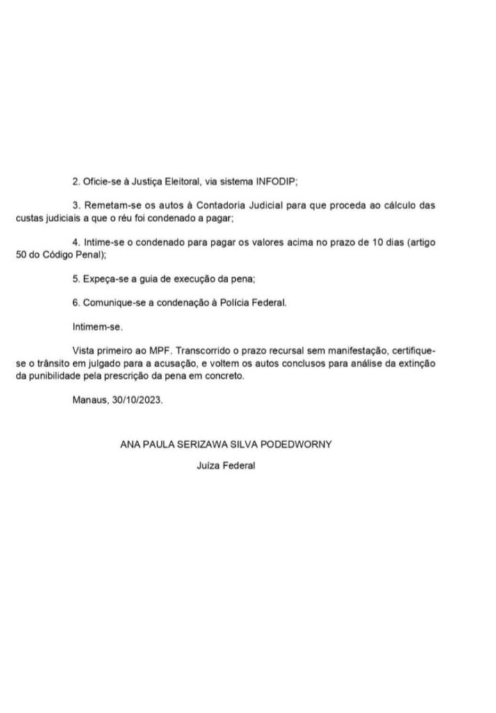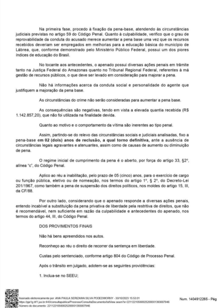 A ação penal pública do processo nº 0000981-03.2019.4.01.3200 resultou na condenação do prefeito do município a dois anos de reclusão e a cinco anos sem exercer cargo ou função pública.