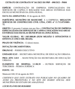 O contrato prevê serviços de capinação externa em escolas municipais localizadas na zona rural de Manicoré. O valor total estipulado para esses serviços é de R$ 1.885.000,00 (um milhão, oitocentos e oitenta e cinco reais).