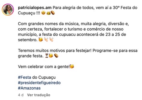 A prefeita que tirar dos cofres de Figueiredo mais de R$ 2,5 milhões para tentar maquiar a sede do município, visando a festa do Cupuaçu. A falta de prioridades da prefeita de Presidente Figueiredo lembra até mesmo a do prefeito de Urucurituba, Sabugo do PT.